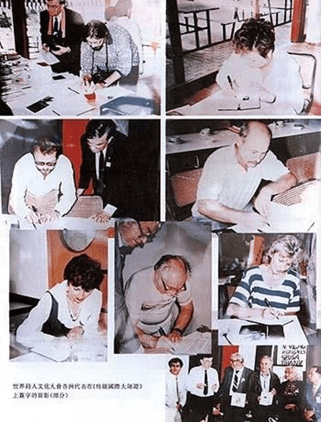 ▲ 世界诗人文化大会各国代表在《特级国际大师》上签字的留影 (部分)